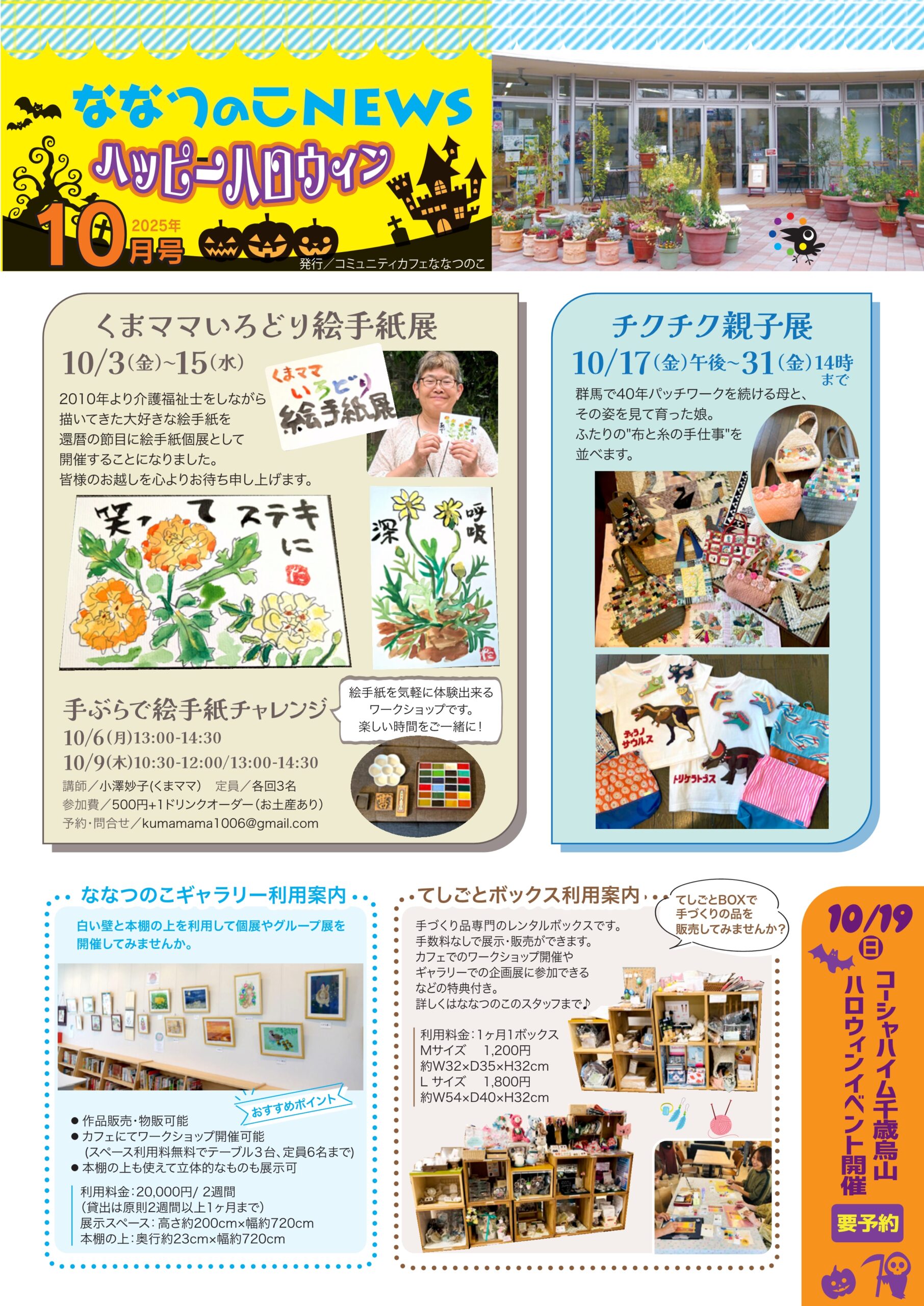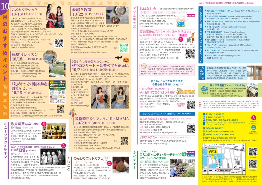ななつのこニュース最新号店頭配布中です! ななつのこニュース10月号、店頭配布中です。 イベント情報やお得な情報がたくさん! ぜひ店頭で手に取ってご覧ください。 ななつのこニュースを置いてくださる、施設や店舗さまも募集しています。 HOMEへ戻る