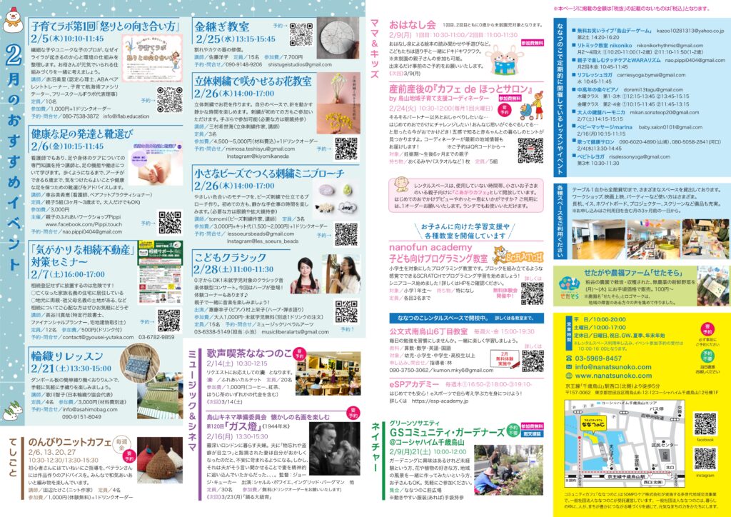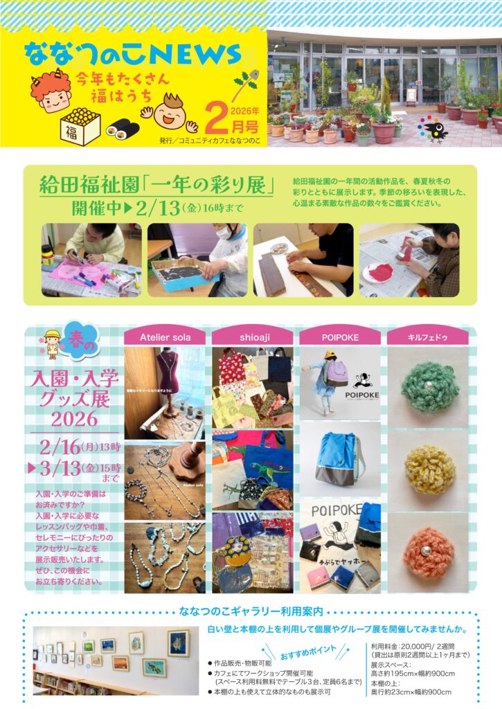 ななつのこニュース最新号店頭配布中です! ななつのこニュース2月号、店頭配布中です。 イベント情報やお得な情報がたくさん! ぜひ店頭で手に取ってご覧ください。 ななつのこニュースを置いてくださる、施設や店舗さまも募集しています。 HOMEへ戻る