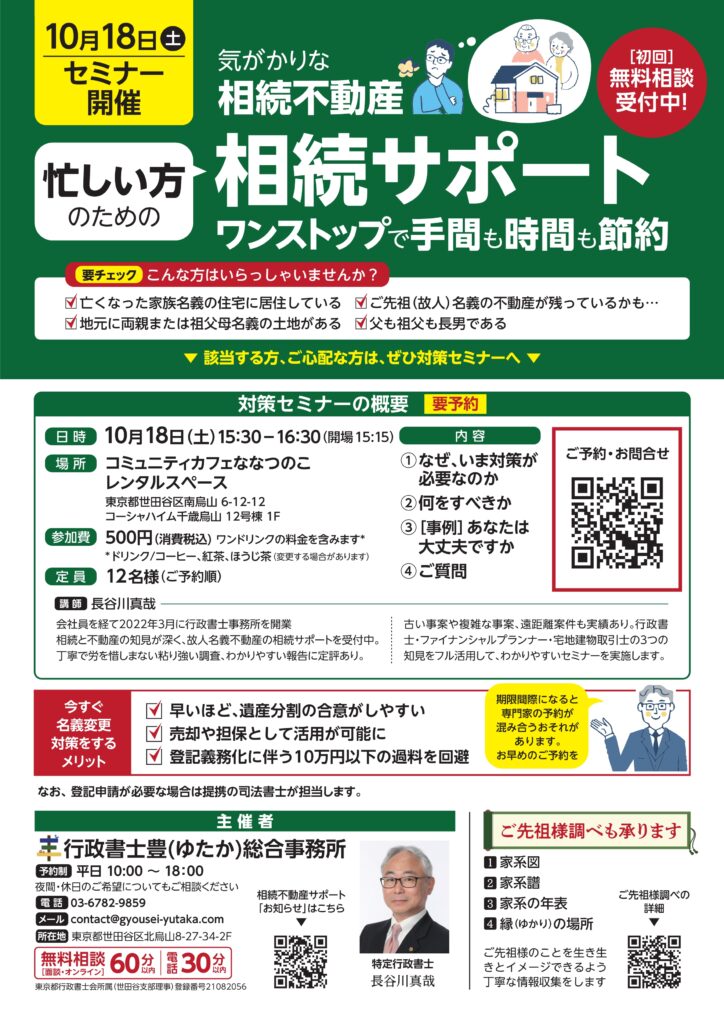 「気がかりな相続不動産」対策セミナー 10/18(土)15:30-16:30
