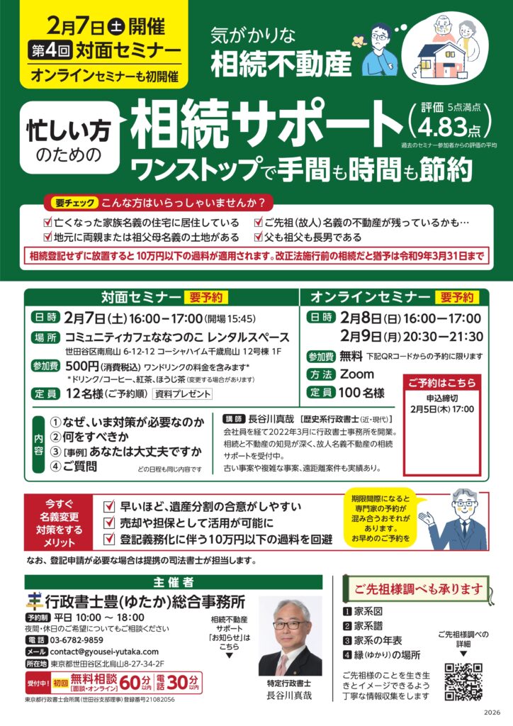「気がかりな相続不動産」対策セミナー 2/7(土)16:00-17:00