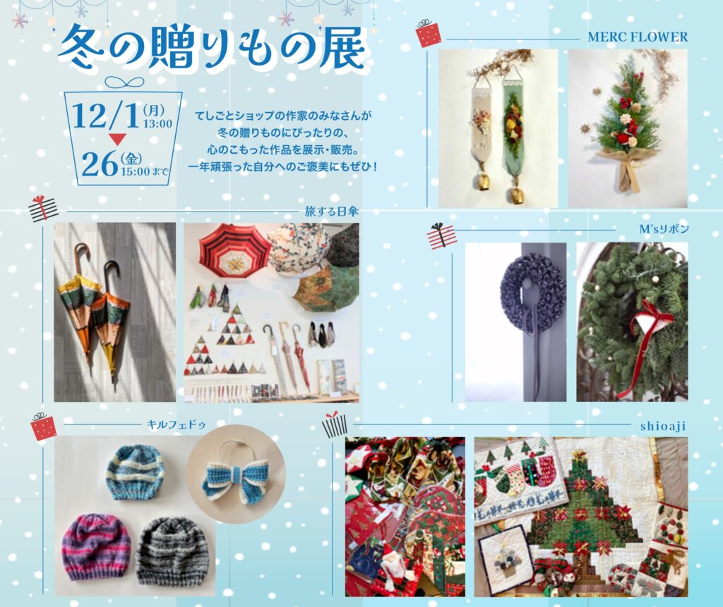 冬の贈りもの展 12/1㈪13:00~26㈮15:00まで てしごとショップの作家のみなさんが冬の贈りものにぴったりの、心のこもった作品を展示・販売。一年頑張った自分へのご褒美にもぜひ! HOMEへ戻る