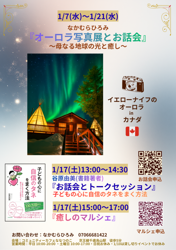 からだと心を整えるセラピストなかむらひろみがカナダイエローナイフでスマホで撮影したオーロラ写真とそこに住む人々の暮らしのご紹介。期間中は、私の潜在意識の先生である谷原由美さんのトークショーや、仲間たちの癒しのマルシェやテーブルワークショップなども開催されます。お楽しみに。
